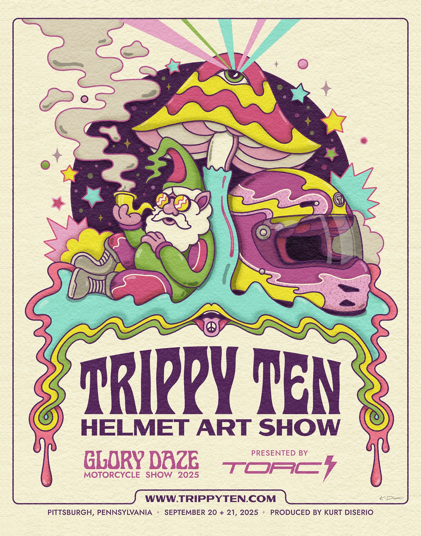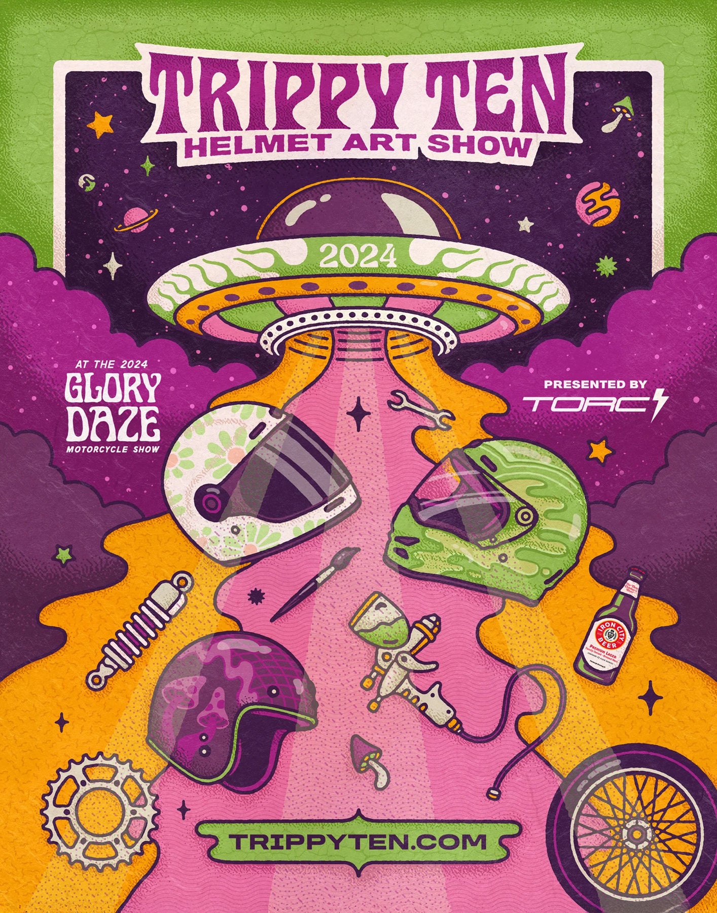 Classic motorcycles and custom paint go together like peace and love. Every year for Glory Daze, ten far-out artists are provided a helmet to paint for a groovy exhibit at the show. Follow along on Instagram, and check out past helmets by selecting a feature below.